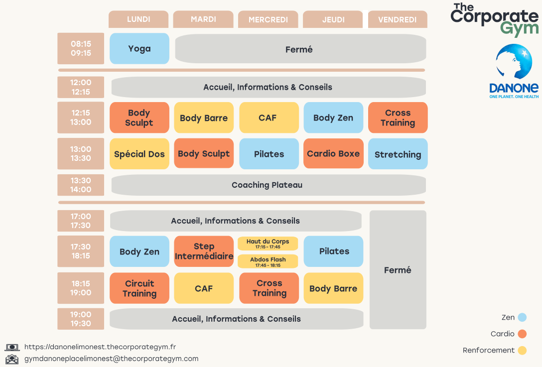 - Body Sculpt : Cours cardio associé à un renforcement musculaire général.